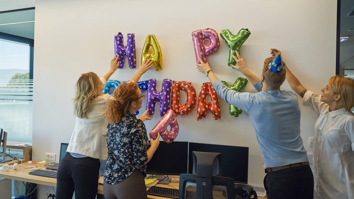 Colleagues decorating office with happy birthday writing